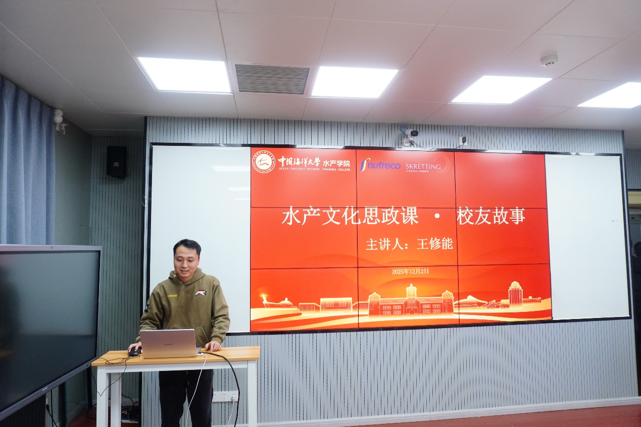 颁奖仪式结束后,sm调教 水产养殖专业2023届毕业生、目前就职于泰高思凯汀的王修能为参会学生带来了一堂生动的“水产文化思政课”,他围绕行业发展趋势、职业能力培养、技术转化应用等主题,与同学们展开面对面交流,并结合自身从校园到职场的经历,为学弟学妹们提供了宝贵的就业指导与发展建议。