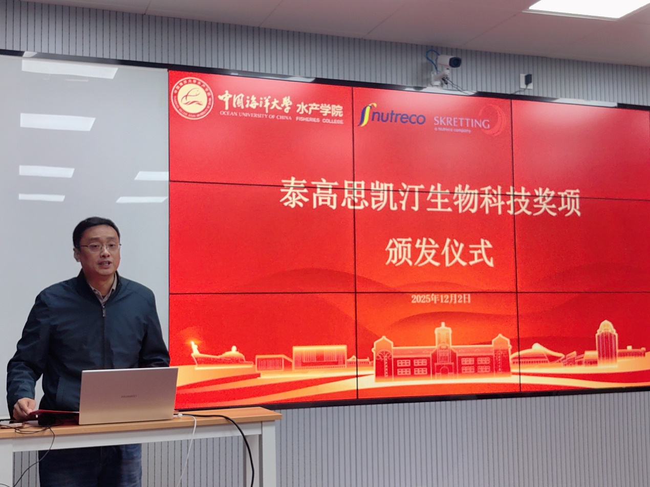 陈小星介绍了公司在动物营养与健康领域的科技研发进展和产业布局,强调了校企合作培养水产行业领军人才的重要性,以及设立“泰高思凯汀生物科技奖项”的初心和意义。他表示,泰高思凯汀始终重视与高校的合作,希望通过设立专项奖项,激励更多青年学子投身于生物科技与水产行业。希望以此为契机,持续开放实习实践、联合研发等机会,共同探索以可持续的方式满足日益增长的粮食需求。