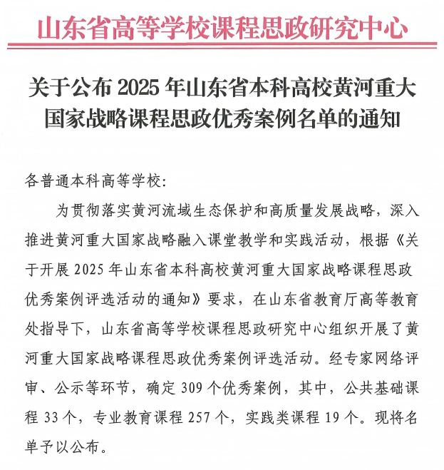 本次优秀案例评选活动由山东省高等学校课程思政研究中心组织,旨在贯彻落实黄河流域生态保护和高质量发展战略,深入推进黄河重大国家战略融入课堂教学和实践活动。经过严格的专家网络评审和公示环节,全省共确定309个优秀案例,其中专业教育课程257个。学校共9个案例入选,刘士凯教授的案例位列专业教育课程优秀案例之中。
