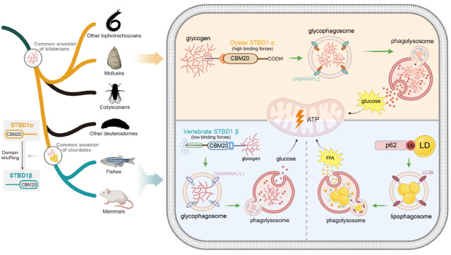 研究解析了 STBD1(starch-binding domain-containing protein 1)的结构演化奥秘。该蛋白中的 CBM20(carbohydrate-binding module 20)是糖原结合的关键功能区域 —— 在脊椎动物中,CBM20 结构域位于蛋白 C 端,而牡蛎的 CBM20 结构域却 “反向” 定位于 N 端。通过蛋白结构建模、分子对接及功能验证实验,团队证实:这种 N 端定位的独特结构能显著增强 STBD1 与糖原的结合能力,并通过与自噬相关蛋白 GABARAPL2 的互作,高效介导糖原向自噬体的转运与降解,从而帮助牡蛎在饥饿胁迫下快速动员能量储备,维持生命活动。这一发现首次阐明了 “结构微进化驱动代谢功能适应” 的规律,完善了自噬通路 “结构 - 功能” 关联的理论体系。